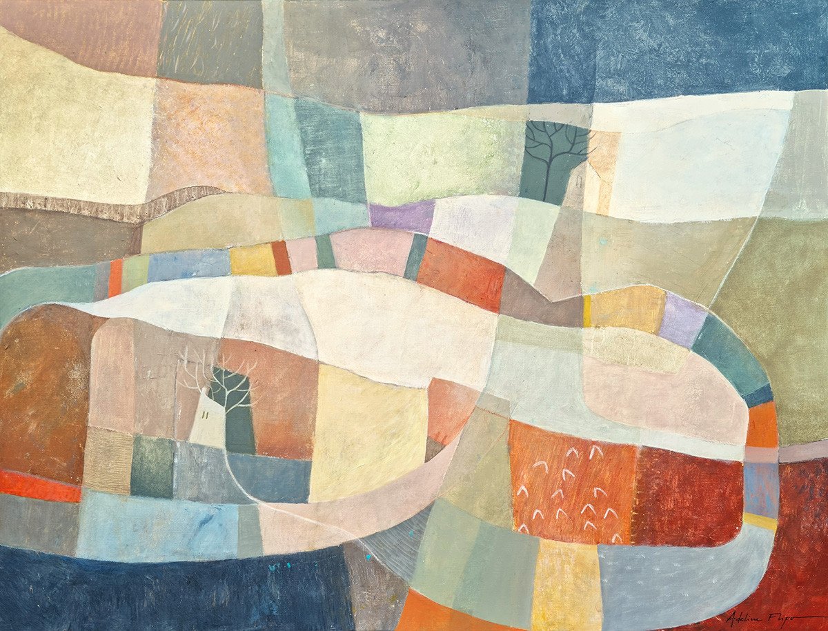 Au milieu de cette apparente abstraction les teintes souvent organiques évoquent le souvenir d'un paysage où se cache volontiers la présence discrète d’un arbre, d’une cabane. Ses couleurs douces, ses jeux de transparences créent une danse visuelle entre calme et effervescence.